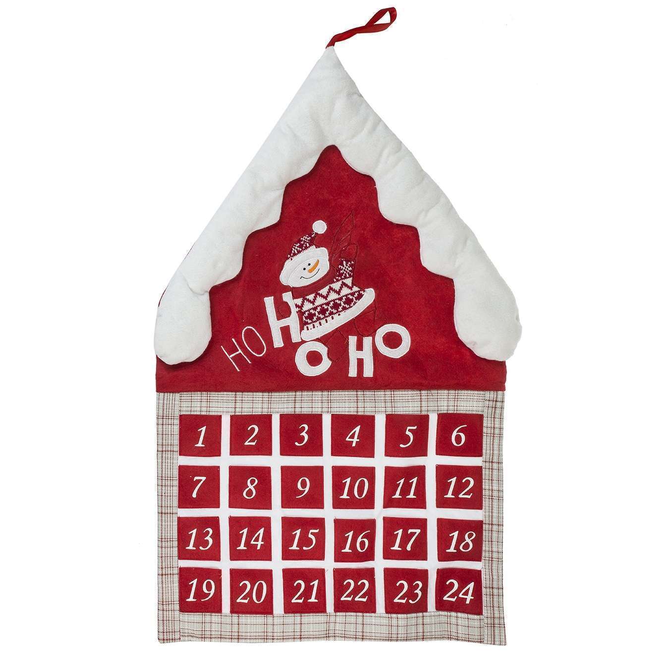 Realizzato in morbido tessuto rosso e panna, ha la forma di una casetta innevata con la scritta “Ho Ho Ho” ricamata e 24 tasche numerate perfette per inserire piccoli regali, messaggi o cioccolatini.