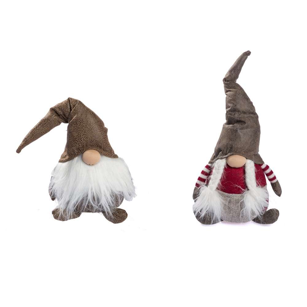 Ogni gnomo misura 46×23 cm ed è rifinito con cura nei dettagli: cappello a punta in effetto ecopelle, barba o trecce sintetiche, e corpo rivestito in tessuto a righe e panno.