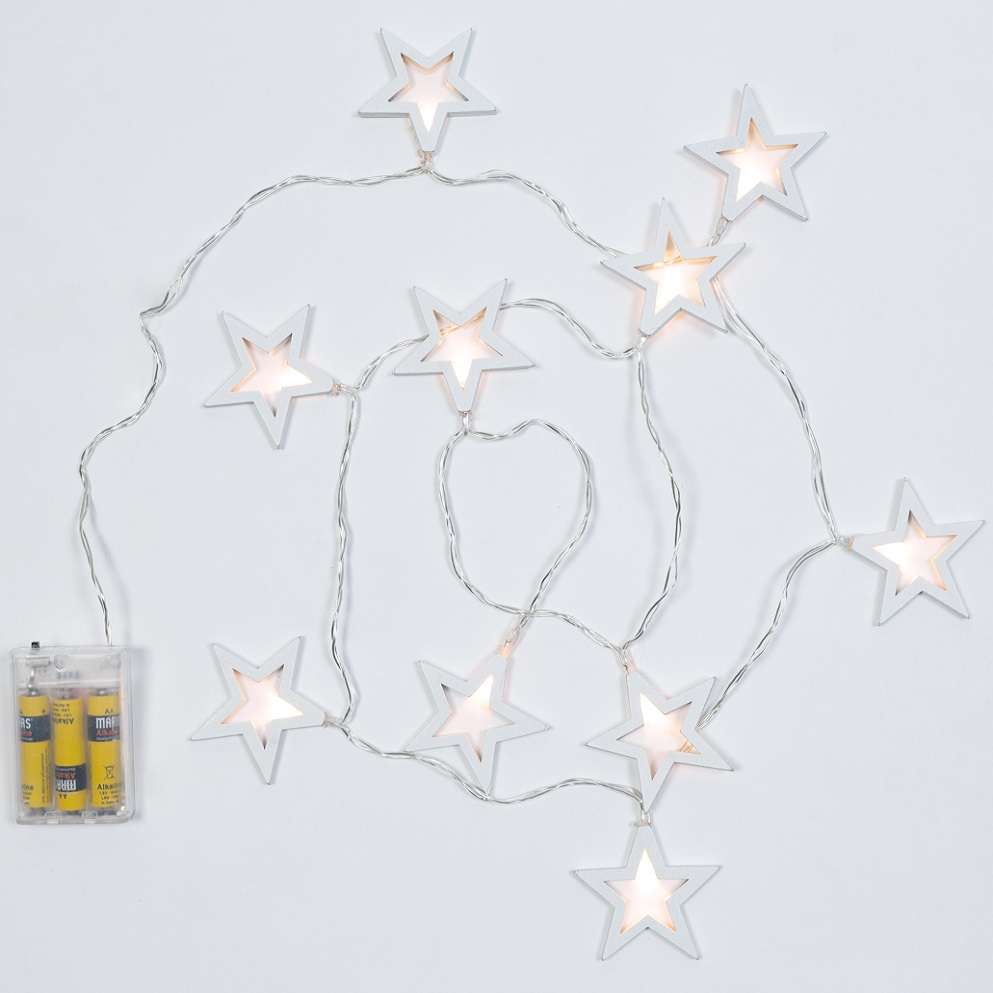 Kette 10 LED Holzsterne warmes Licht 1,5 m batteriebetrieben. Warme und traditionelle Atmosphäre.