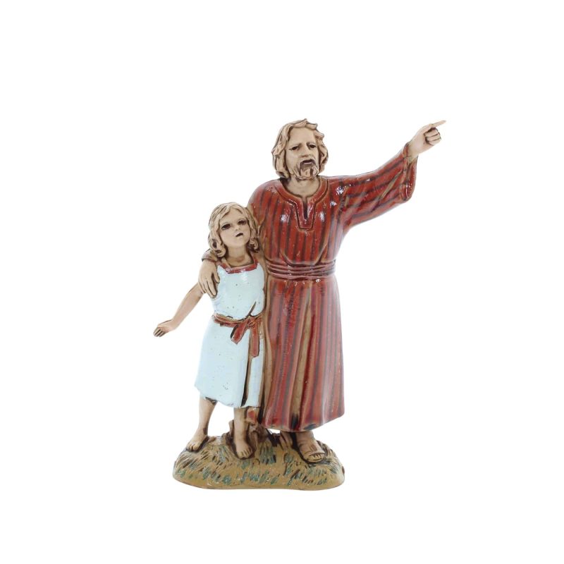 Der Mann mit Mädchen Standard 10 im arabischen Stil ist eine zarte Figur voller Details, die perfekt ist, um der Krippe Realismus und Wärme zu verleihen. Aus hochwertigem PVC, mit Siebdruckpräzision bemalt, stellt es einen Vater mit seiner Tochter in beschützender Haltung dar, geeignet für Krippen im Maßstab 1:20. Maße: Höhe 9,2 cm.