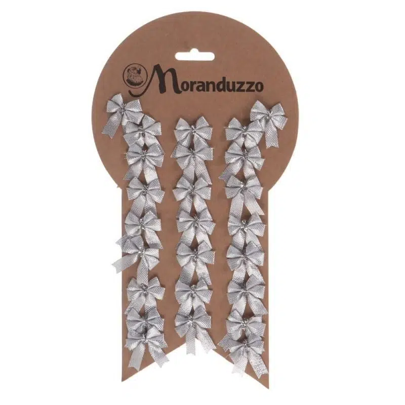 Set mit 25 silbernen Schleifen mit einem Durchmesser von 3 cm: eine praktische Lösung, um Pakete, Tischkarten, Girlanden und Bäume zu verzieren. Kühles Metallic-Finish, ideal in der weiß/silbernen Farbpalette. Einfach zu befestigen, sofortiger eleganter Effekt. Moranduzzo.