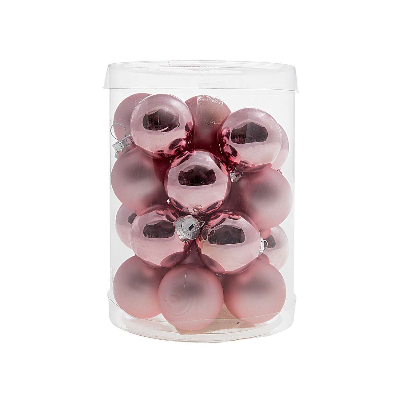 Set mit 24 rosafarbenen Ø3 cm Glaskugeln, romantische und zarte Weihnachtsdekoration.