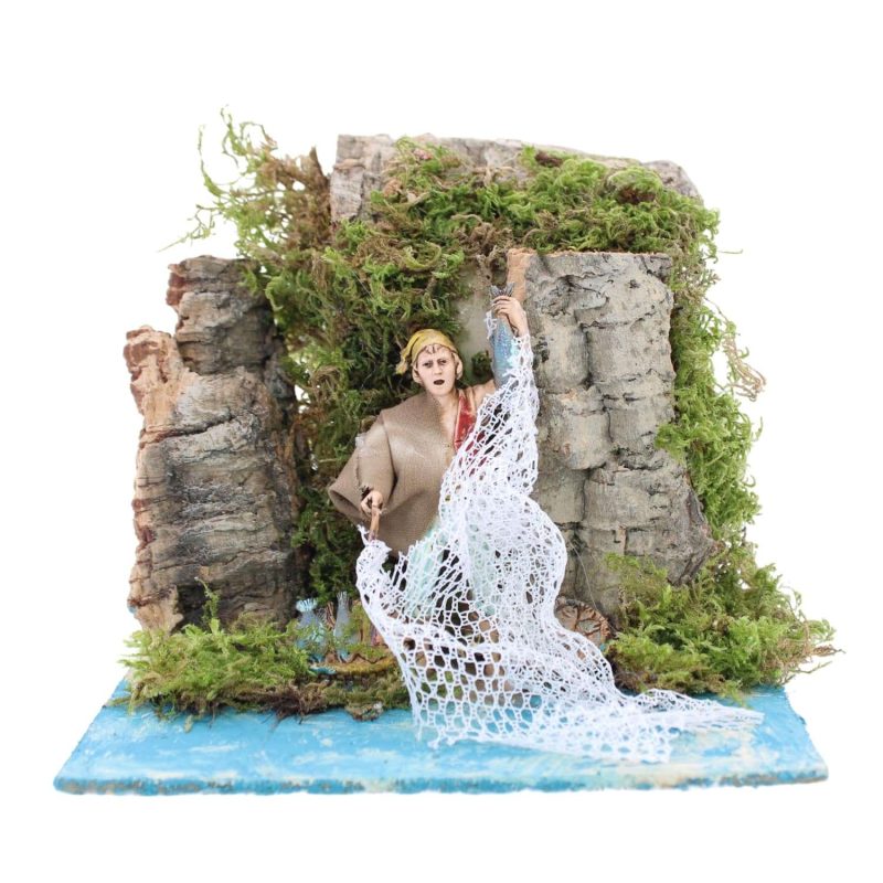 Characteristic animated figurine of a fisherman busy pulling nets, perfect for recreating authentic scenes in your nativity scene. Powered by 220V and hand-painted with attention to detail, this 1:20 scale figure is a dynamic and fascinating addition to your Christmas scenery.