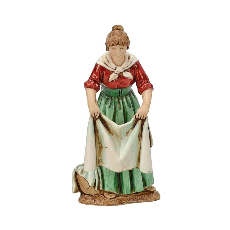 Moranduzzo Standard 10 “Woman Stretching” figurine for nativity scenes in Neapolitan style, made of unbreakable PVC and hand painted. 10 cm high and sculpted by Martino Landi, it is ideal for adding realism and authentic details to your nativity scene. Registered with the Ministry of Cultural Heritage and Activities.