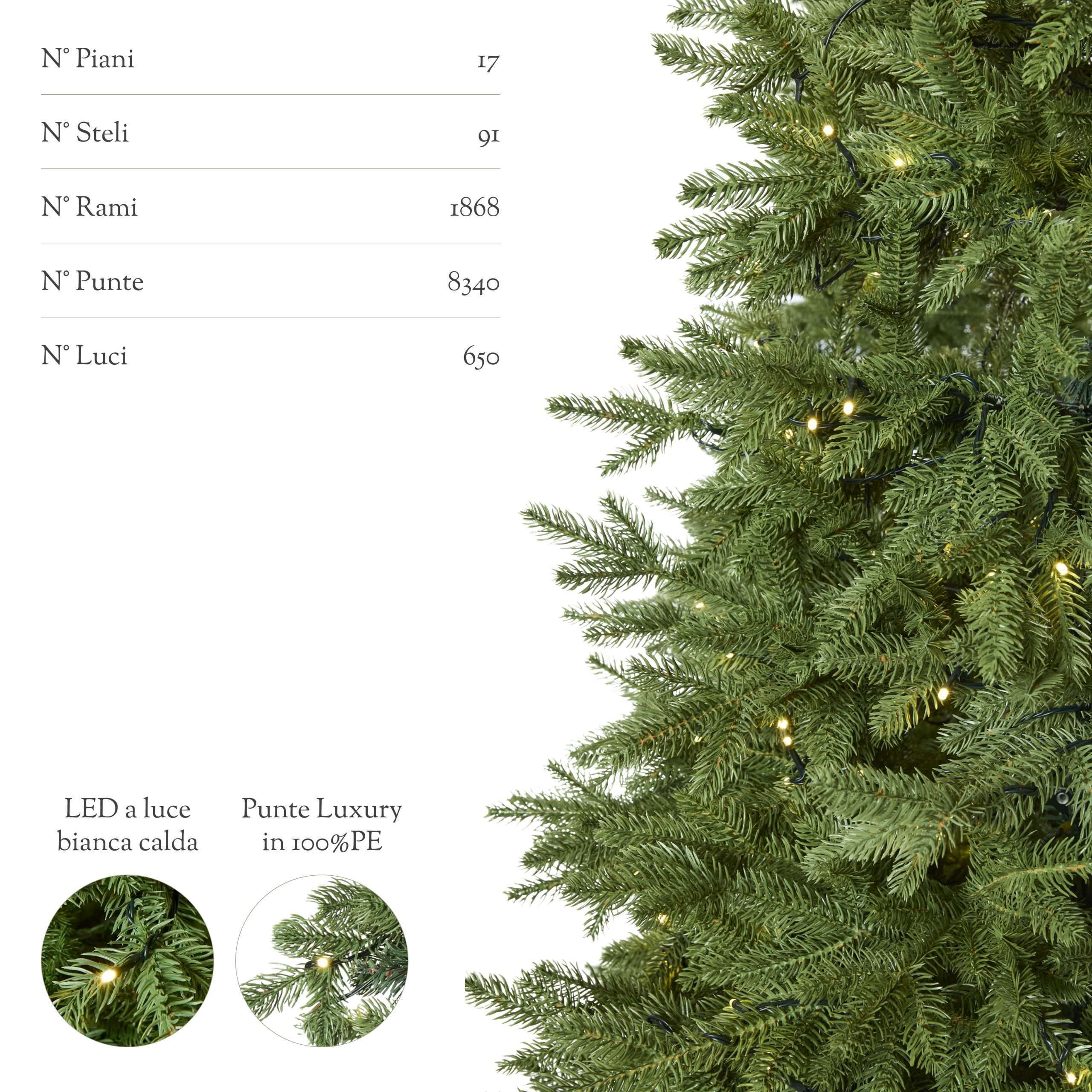 Cada rama, cada aguja está hecha íntegramente de PE Total Real Touch efecto, para una fidelidad estética y táctil que solo Moranduzzo, inventor del árbol de Navidad artificial en Italia, puede garantizar.