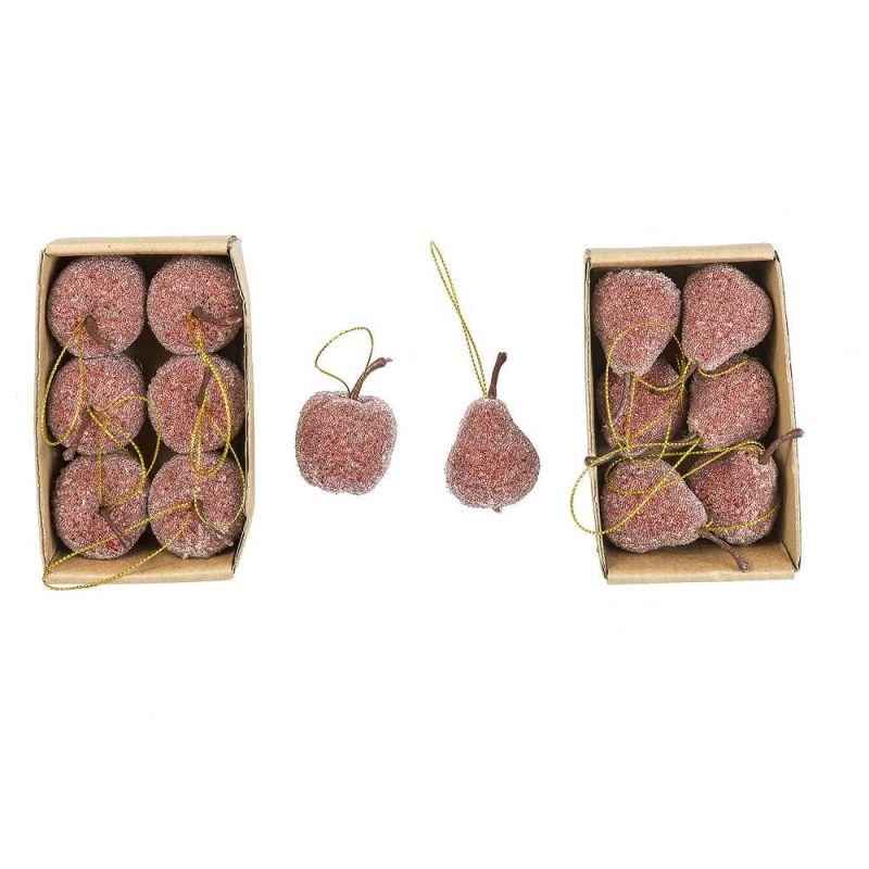 Caja 6 hielos frutales Ø4 cm manzana y pera roja; originales y coloridos adornos navideños, perfectos para el árbol y la decoración animada.