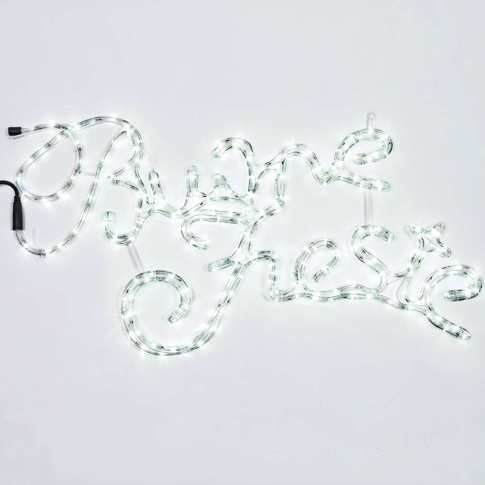 Letrero LED «Felices Fiestas» – 224 LEDs Blanco Hielo (10 intermitentes + 214 fijos) – 82×42 cm – 230V – cable de goma – uso exterior