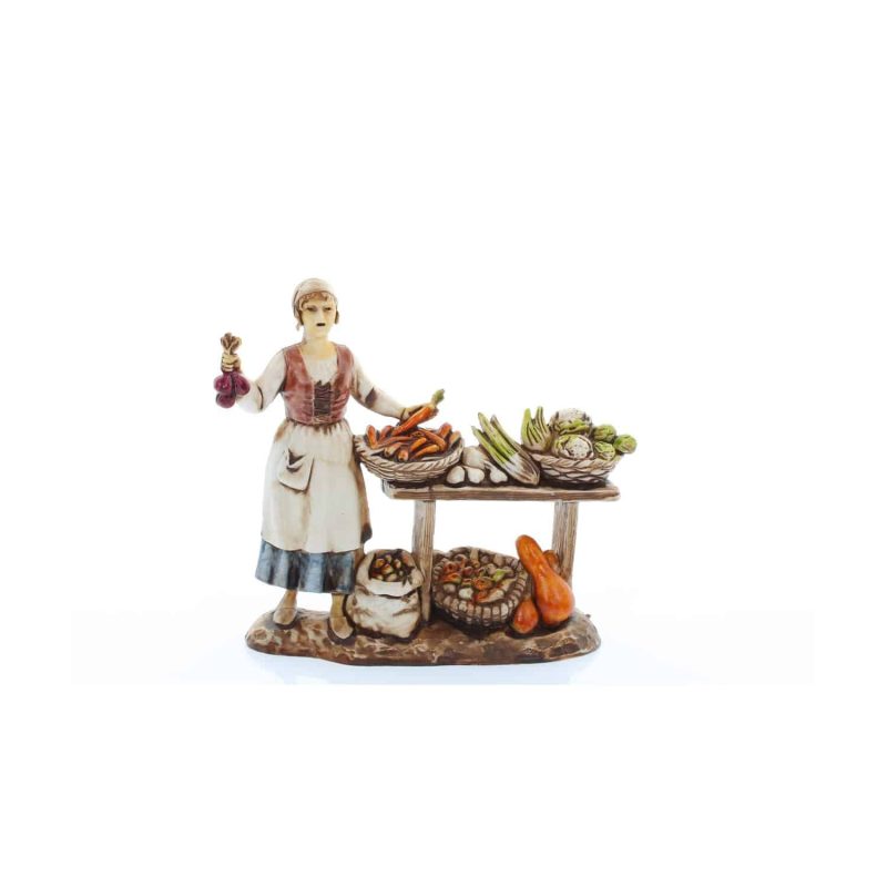 La figura Ortolana Compact 8 Moranduzzo, pintada a mano en estilo napolitano, está hecha de PVC y representa un vendedor de verduras típico para los belenes tradicionales. Mide 7,7 cm (ancho) x 2,8 cm (fondo) x 8 cm (alto) y es ideal para belenes a escala 1:22. Da realismo y autenticidad a la escena navideña, perfecta para realzar composiciones populares y rurales con detalles cuidados y auténticos.