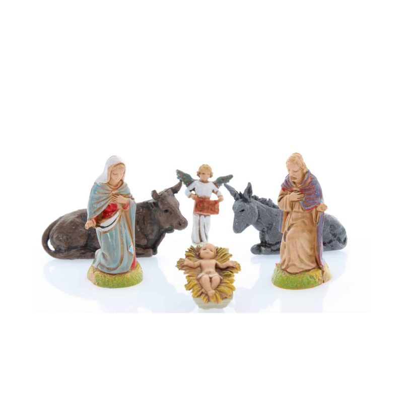 Elegante composición navideña con la Sagrada Familia en miniatura, pintada con técnica de serigrafía al estilo histórico napolitano. Ideal para crear pequeños belenes sin renunciar a detalles auténticos, emotivos y precisos, en el estilo inconfundible de Moranduzzo.