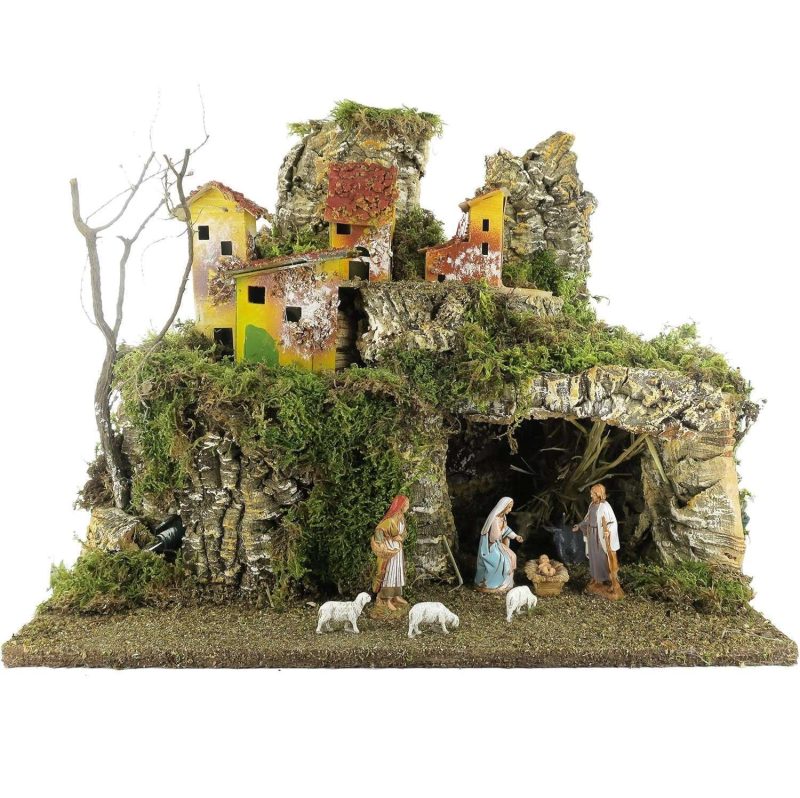 Pueblo iluminado con Belén: conjunto completo de resina con luces integradas. Ideal para un belén compacto pero escénico de 38x28x30 cm.