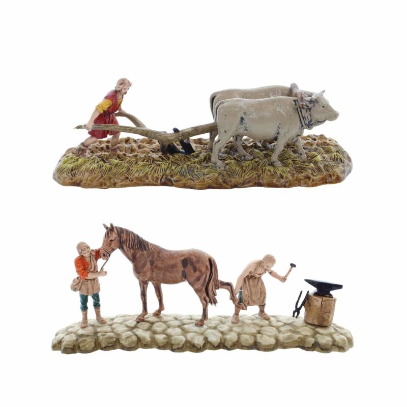 Escenografía compuesta por 2 Escenas “Arado y Herrador” Mini 6 en estilo napolitano, para belenes a escala 1:22 firmado Landi. Este conjunto reproduce en miniatura dos escenas clásicas de la vida campesina y artesanal: el agricultor con el arado y el herrador trabajando. Fabricados en PVC de alta calidad y pintados con precisión en serigrafía, son perfectos para crear escenarios realistas y detallados incluso en las escenas más pequeñas y refinadas del belén tradicional napolitano.