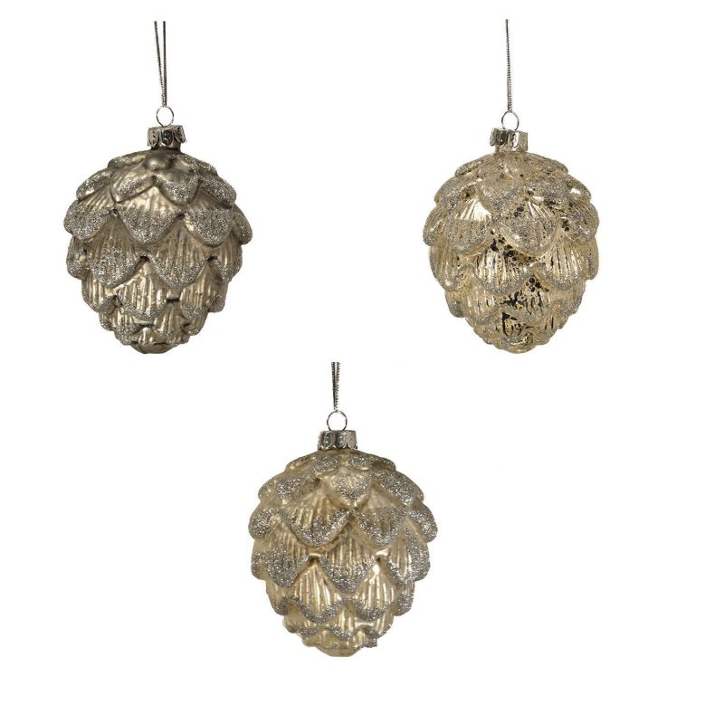 Set de 3 piñas de cristal H10 cm plateadas en 3 tonos, decoración natural y brillante para el árbol.