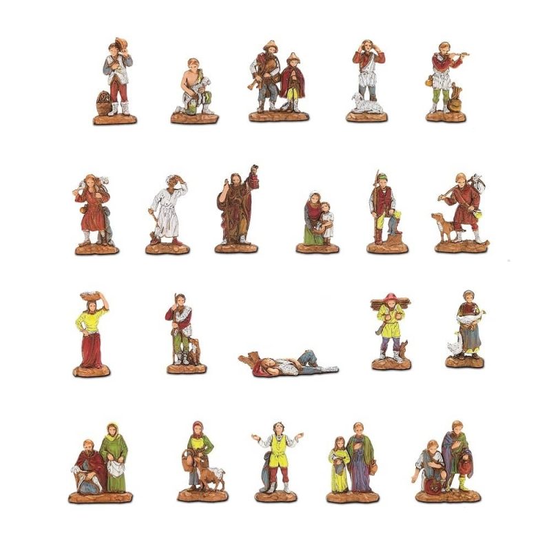 Conjunto Moranduzzo compuesto por 7 pastores Surtidos Micro 3.5 pintados en serigrafía, estilo napolitano, escala 1:50, fabricados en PVC. Perfecto para enriquecer tu belén con escenas animadas llenas de vida cotidiana en miniatura.