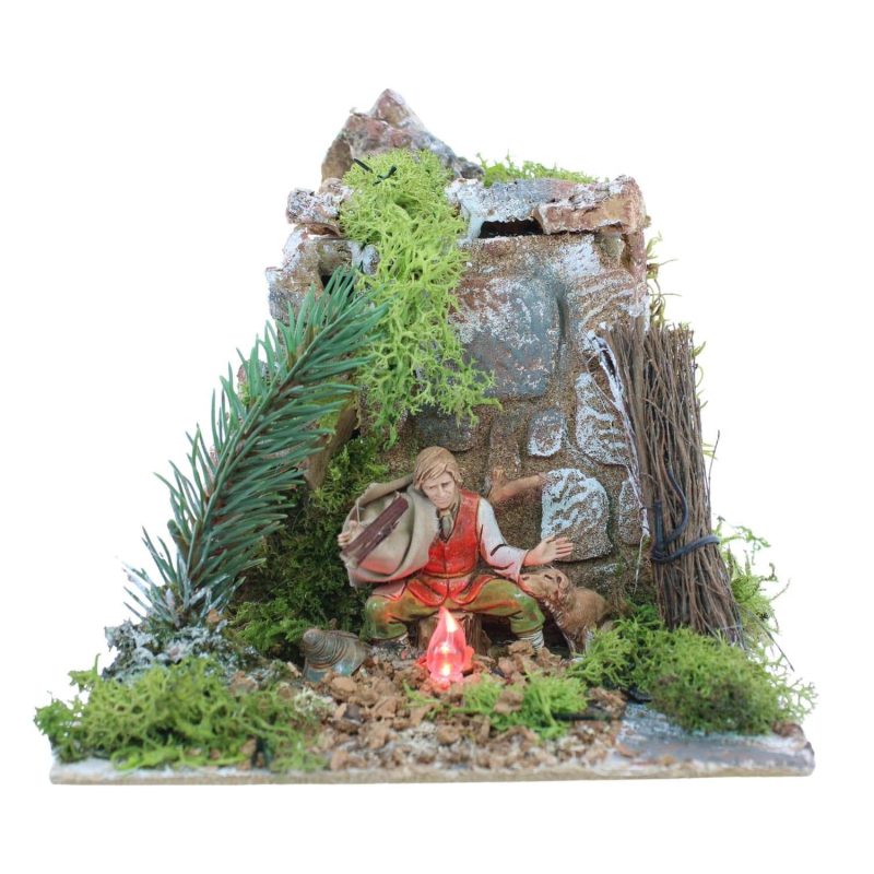 Scénographie animée représentant un homme assis près du feu avec une lampe et un feu réaliste. La figurine, détaillée peinte à la main en PVC et en bois, donne une touche chaleureuse et réaliste à votre crèche grâce aux mouvements fluides et naturels. Idéal pour les crèches artisanales à l’échelle 1:20, alimentées par 220V.