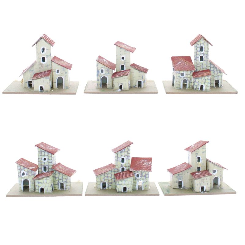 Ensemble de 6 maisons en carton pour crèches, mesurant 10x5x8 cm. Parfait pour recréer de petits villages, finis à la main dans le style napolitain. Un accessoire polyvalent et décoratif pour votre crèche.