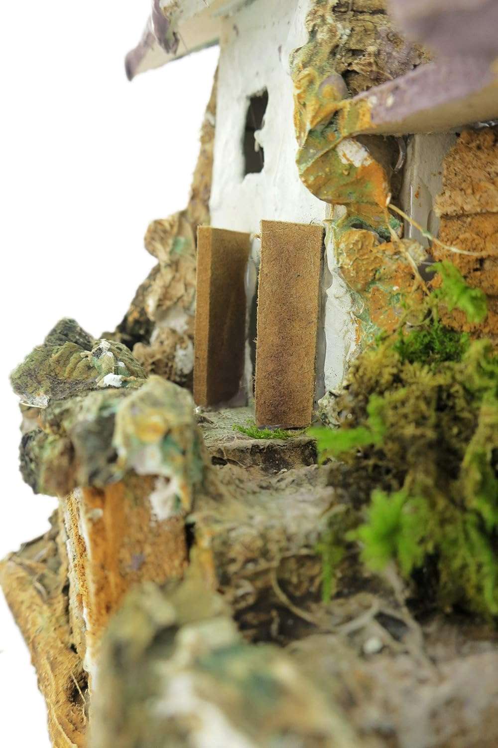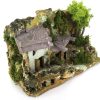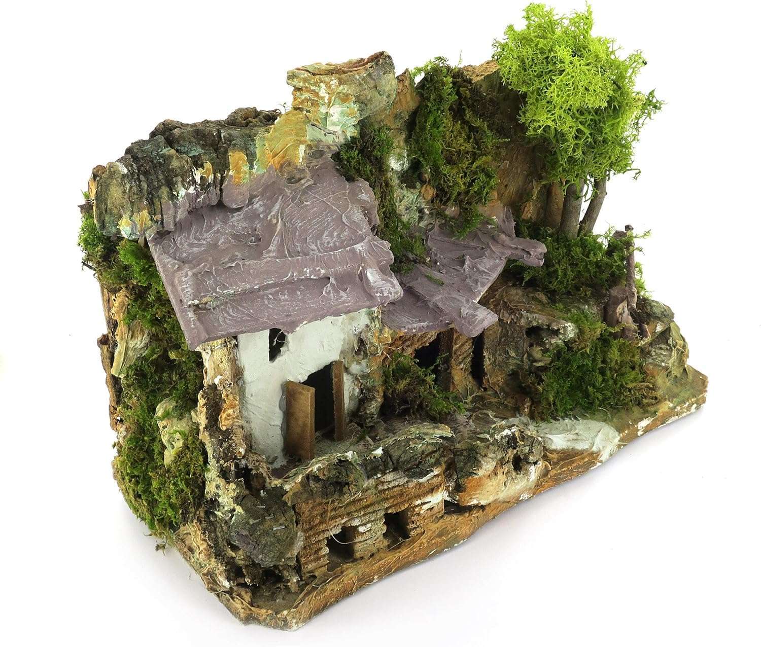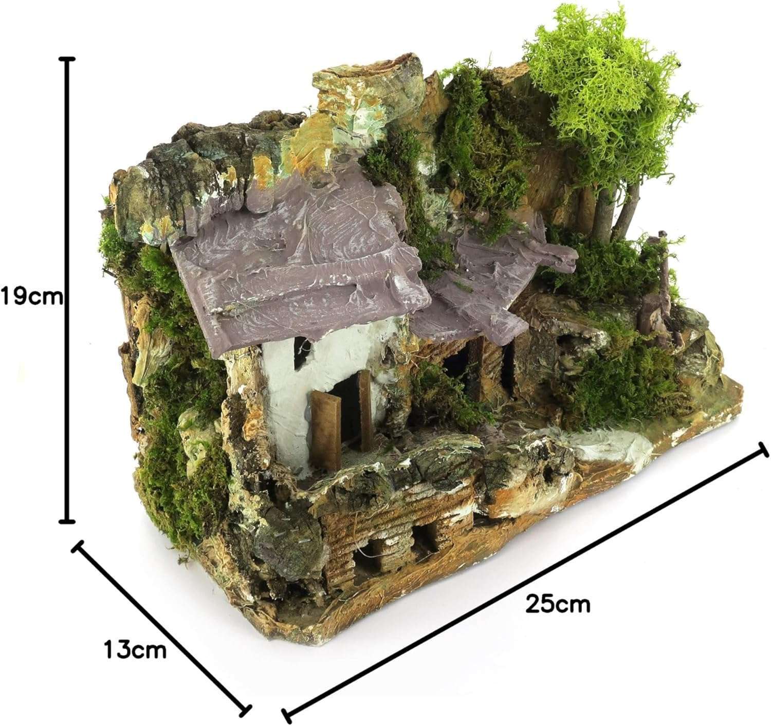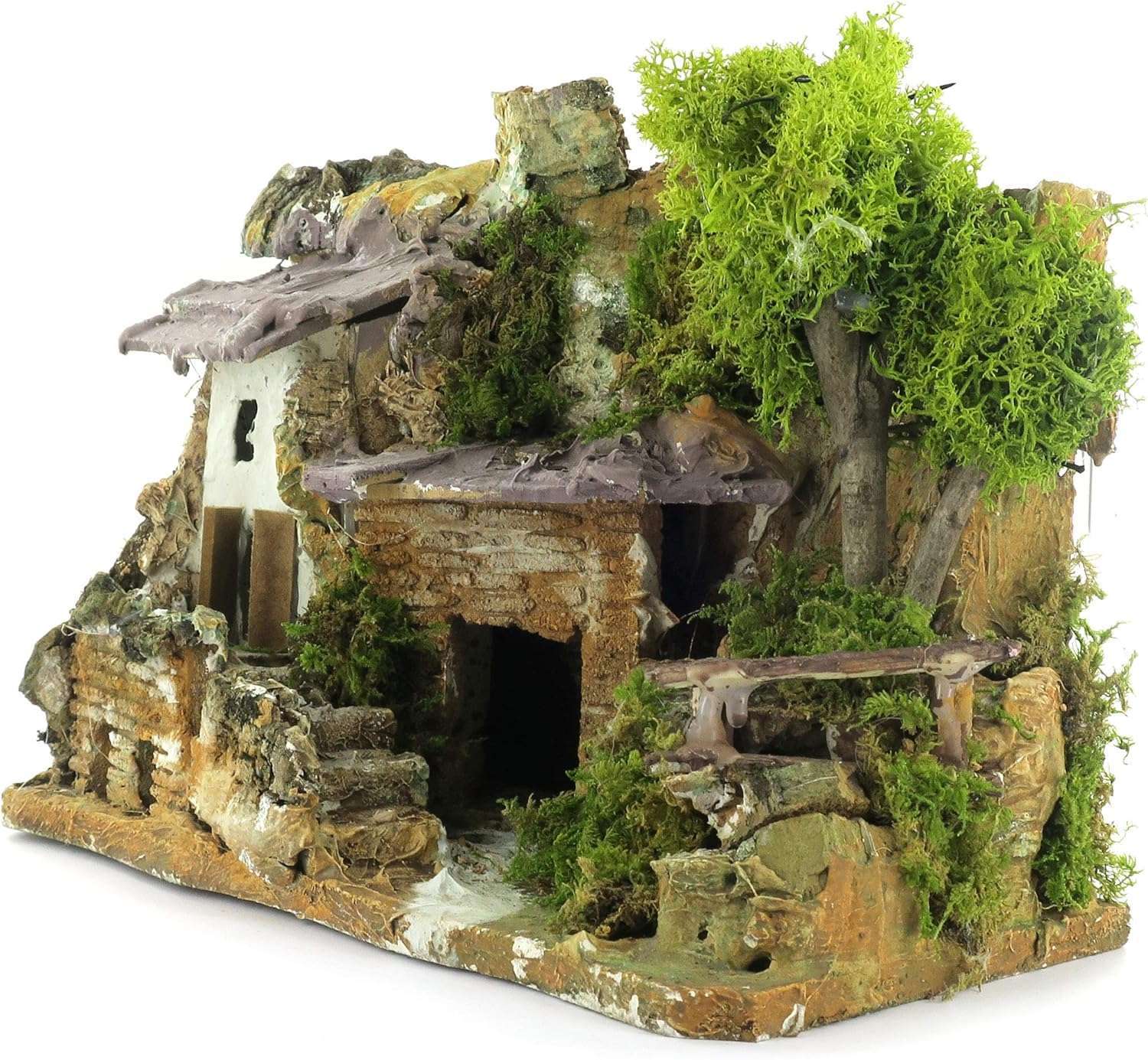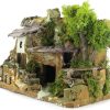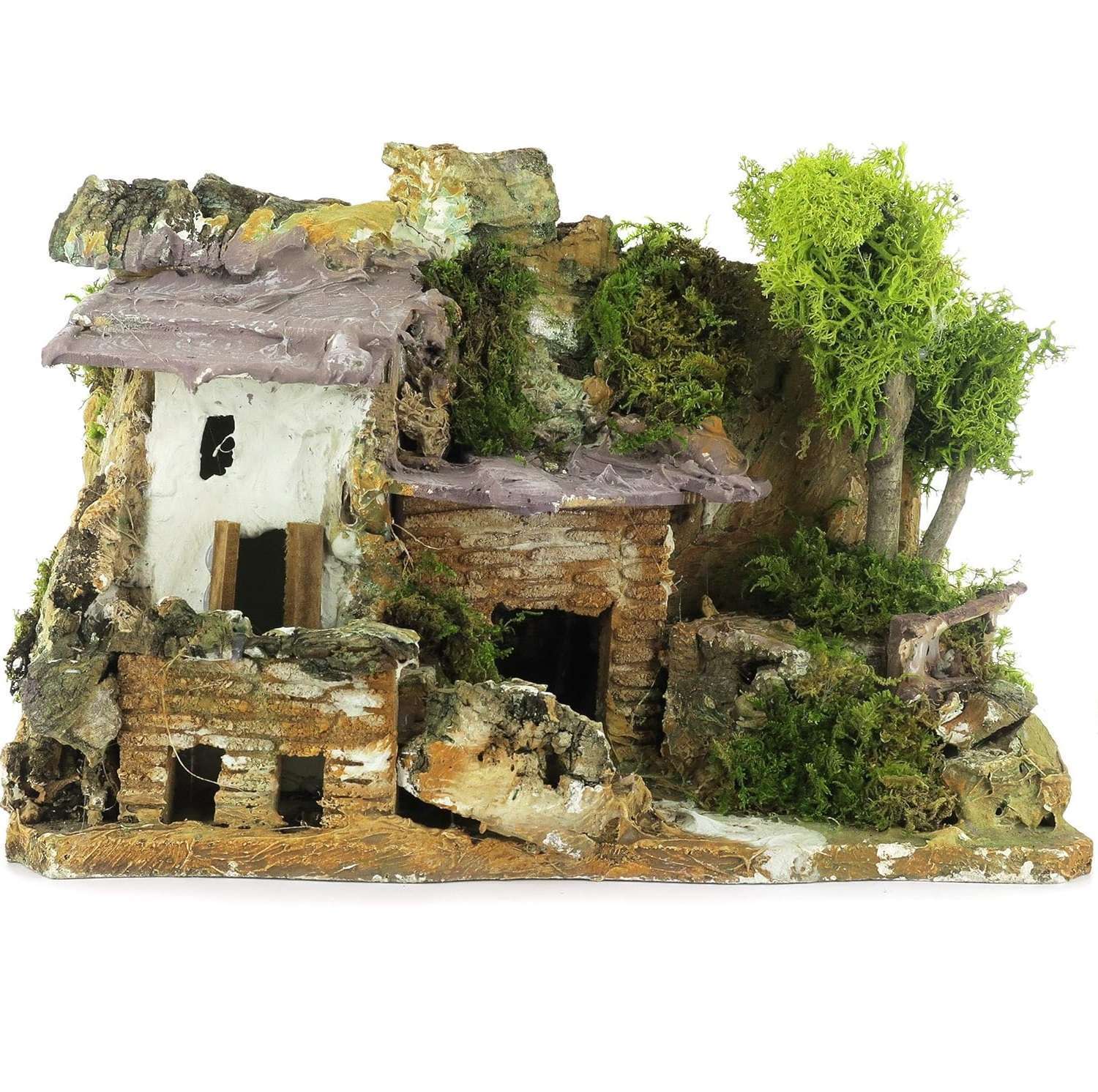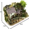Maison en stuc avec abri en bois, parfaite pour les crèches rustiques. Réalisme, souci du détail et cadre champêtre 15x25x19 cm.