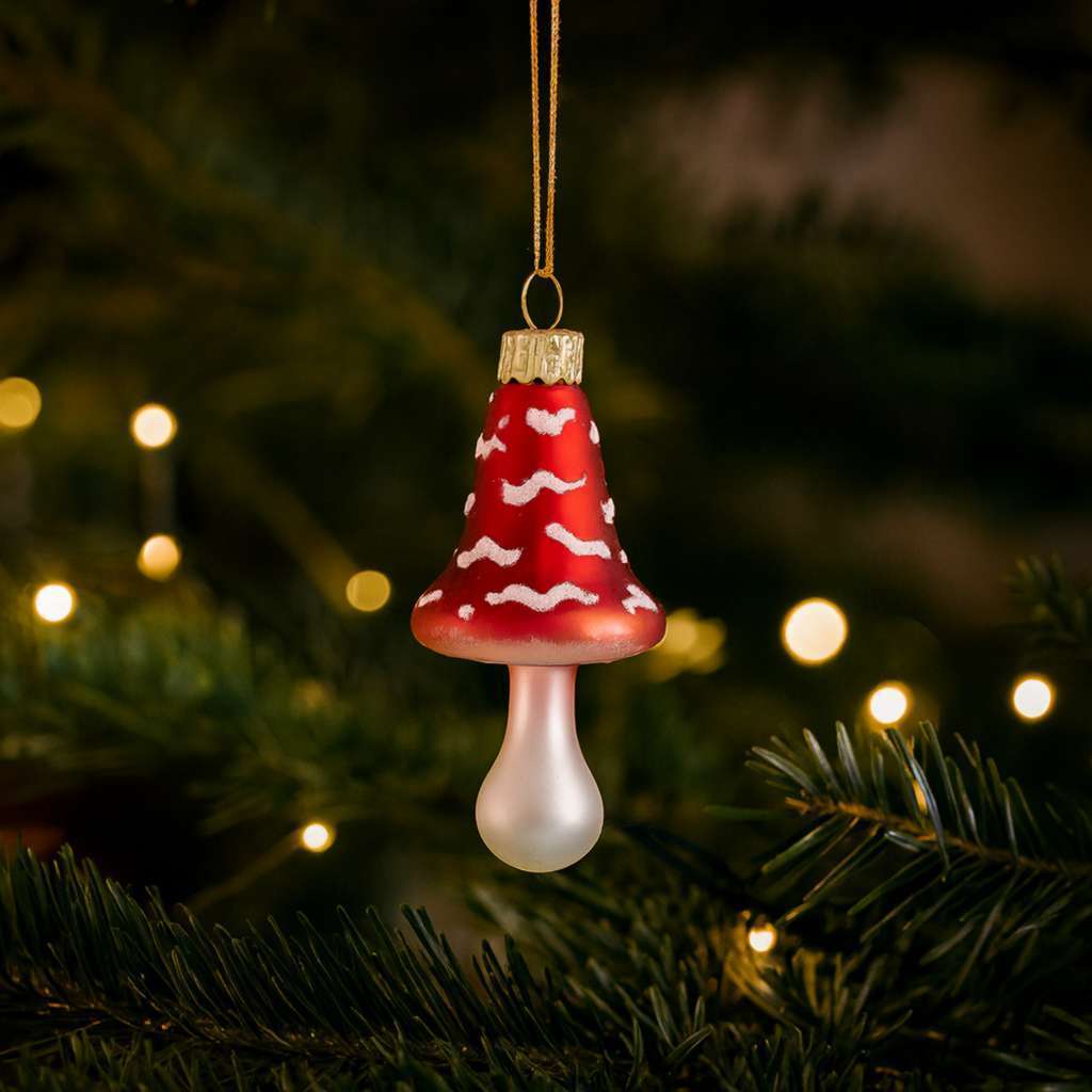Champignons à pois blancs/rouges en verre h 9 cm (set 3) : trois sujets féeriques qui racontent l’histoire de la forêt d’hiver dans les couleurs classiques de Noël ; le verre donne de la profondeur et de la lumière, les pois créent du rythme et de la sympathie ; idéal pour les arbres naturels-chic ou pour ajouter une touche de pop aux palettes traditionnelles, combinés avec des pommes de pin, des baies et des rubans de jute.