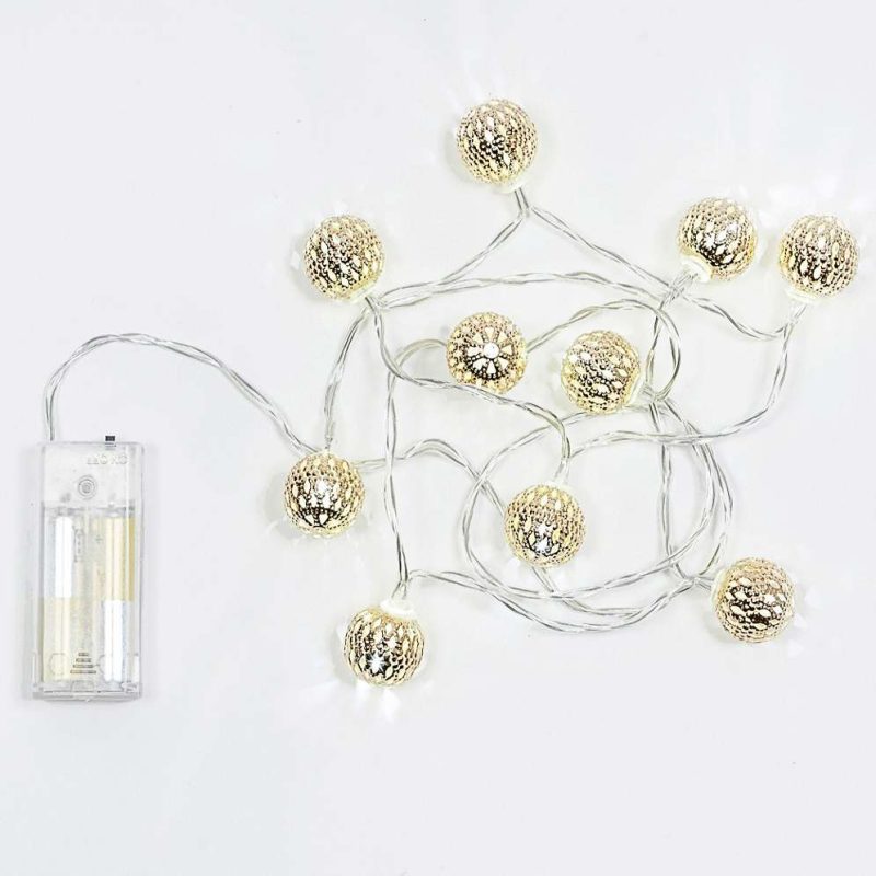 Catena 10 sfere metallizzate oro Ø2,5 cm con 10 LED luce fredda, filo trasparente, a batteria; décor elegante e luminoso per interni, perfetta per tavoli e mensole.
