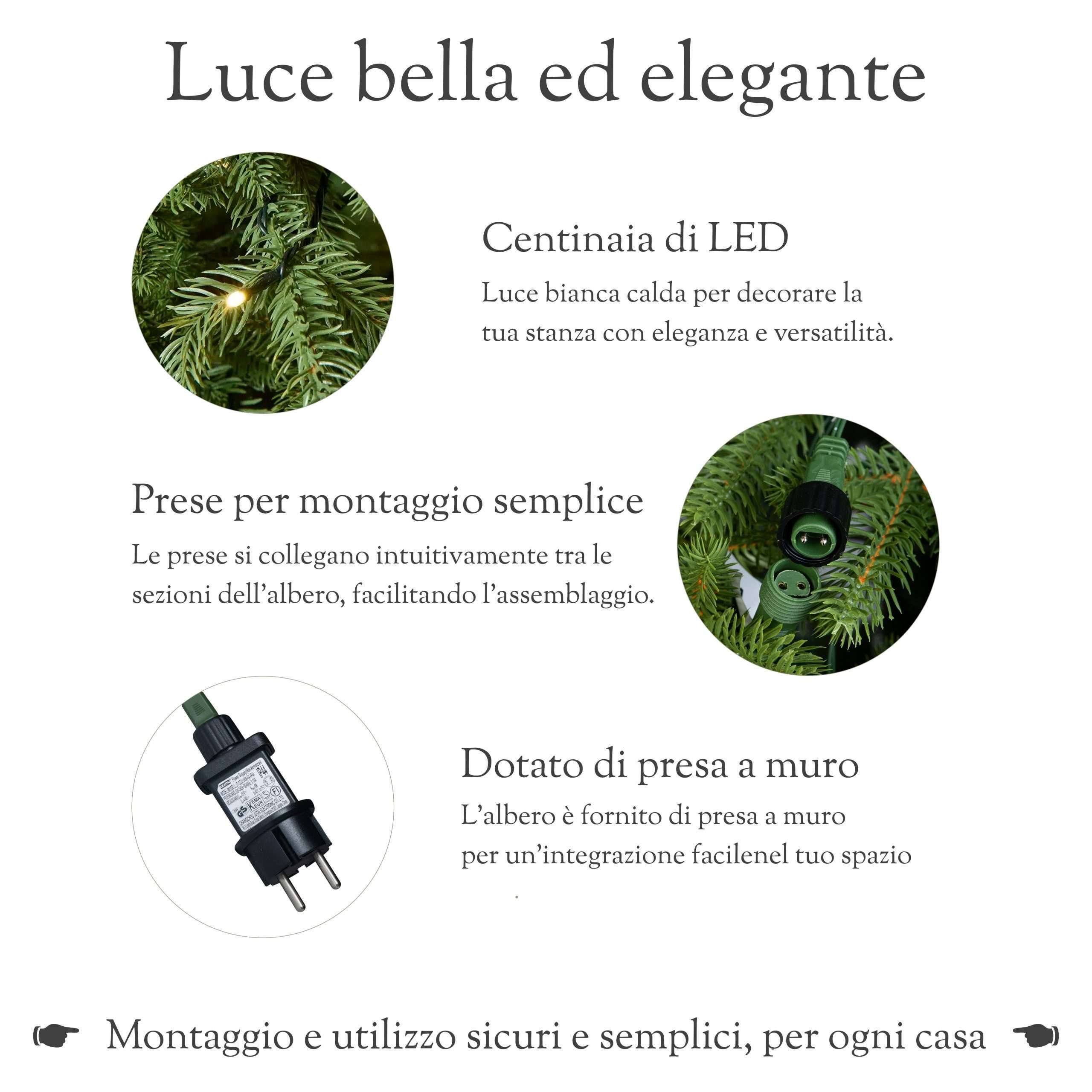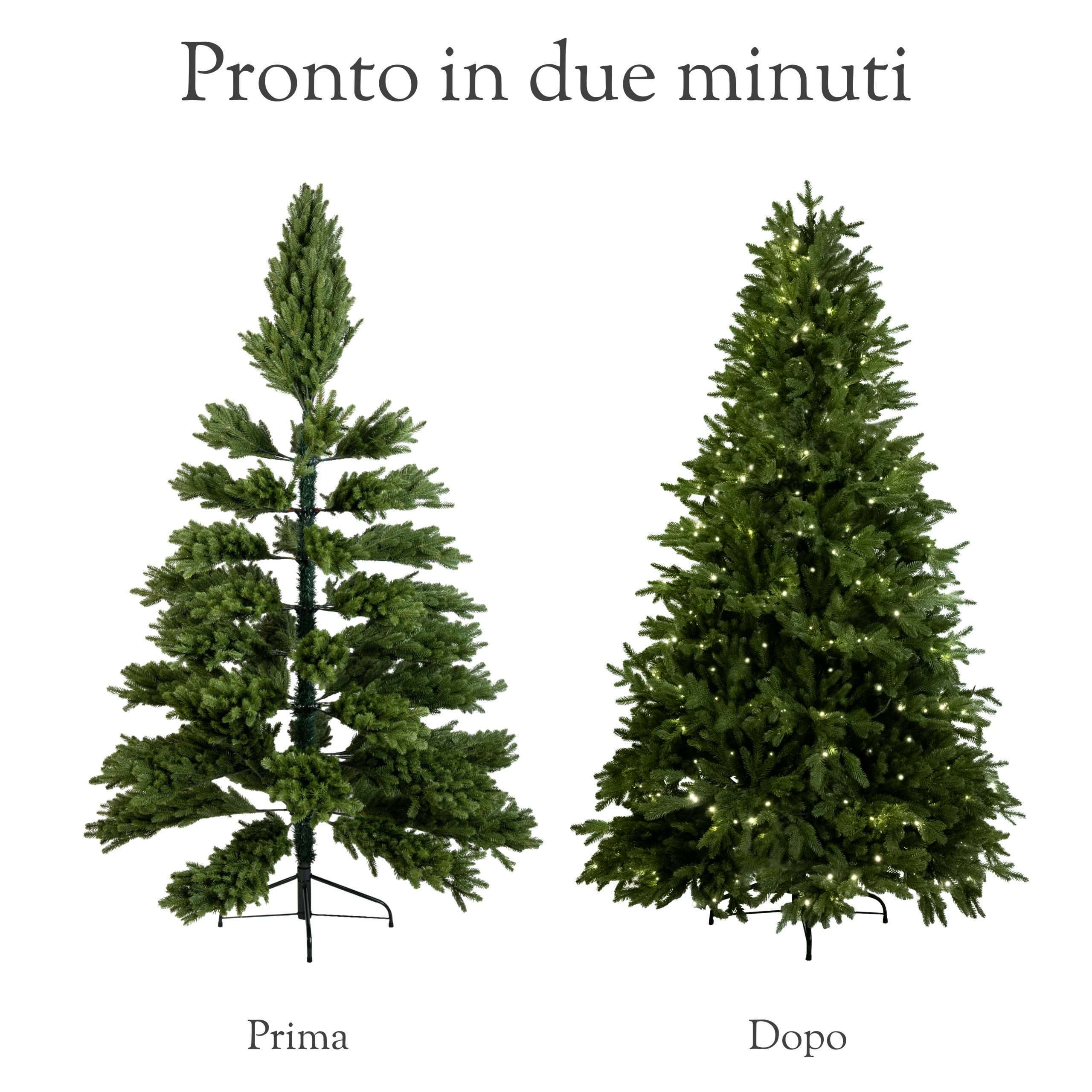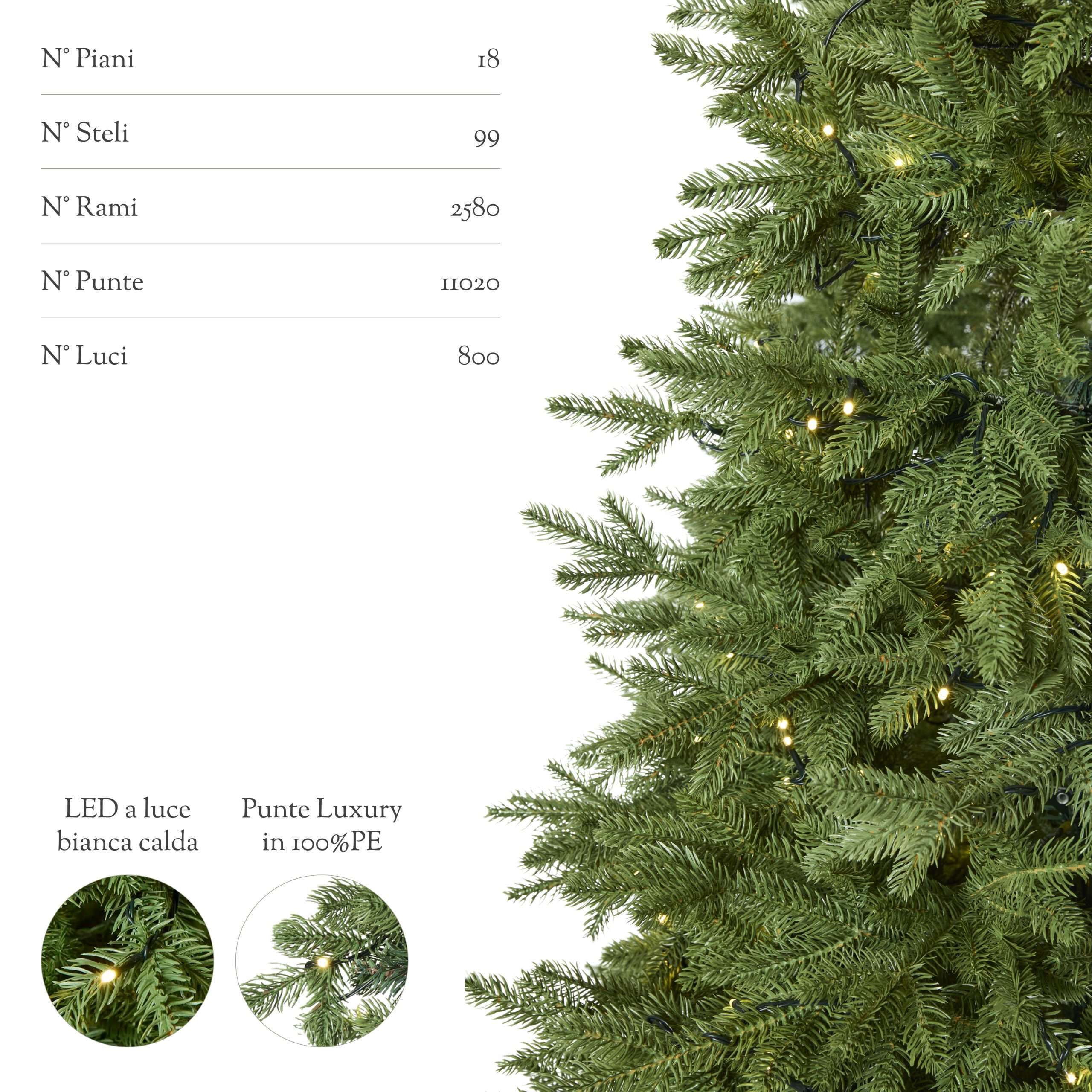 Realizzato interamente in polietilene (PE) Total Real Touch, offre una resa visiva e tattile identica a quella di un vero abete. Le 800 micro-luci a LED preinstallate emettono una luce calda e avvolgente, eliminando la necessità di montare catene luminose aggiuntive.