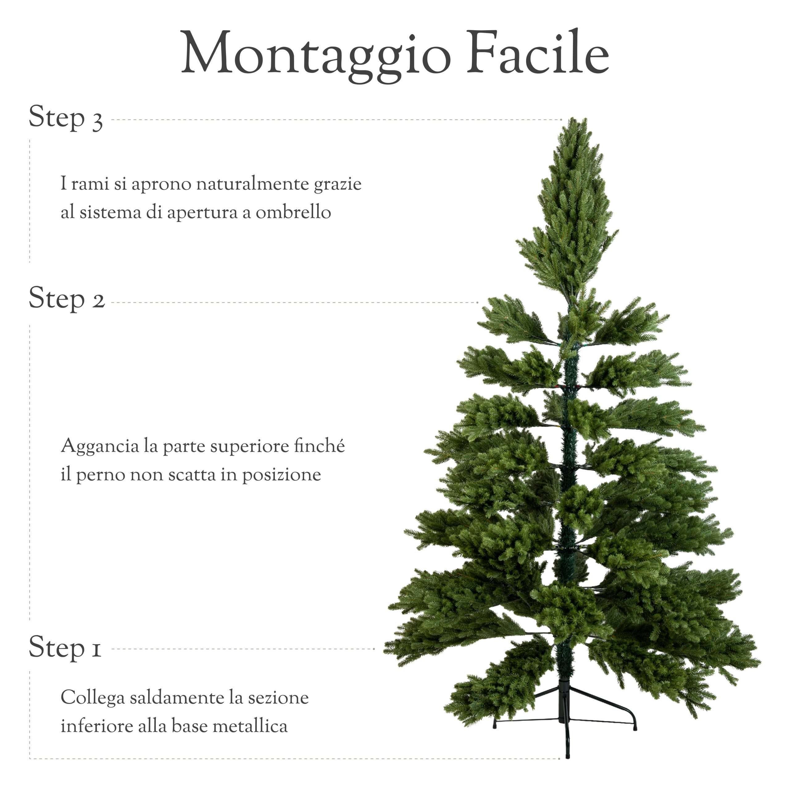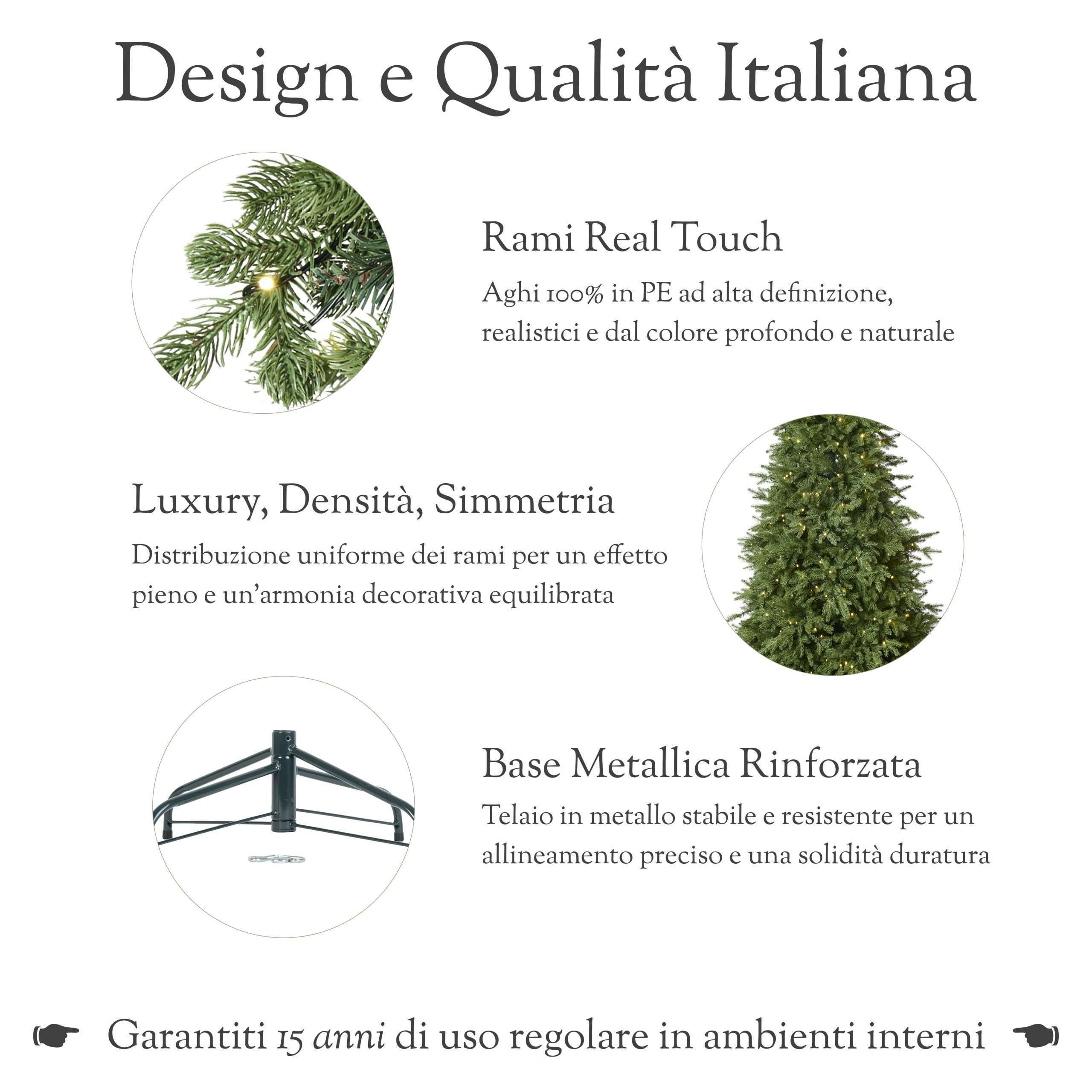 Ogni ramo e ogni ago dell’albero è realizzato interamente in PE effetto Real Touch, modellato con stampi tridimensionali che riproducono fedelmente: