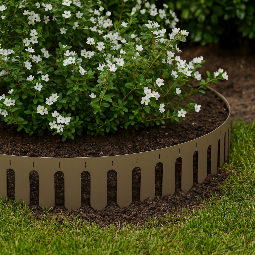 Bordura in metallo per aiuole, robusta e discreta. Il suo elegante colore Marrone RAL 8025 la rende perfetta per organizzare giardini e spazi verdi, adattandosi splendidamente anche a contesti rustici.