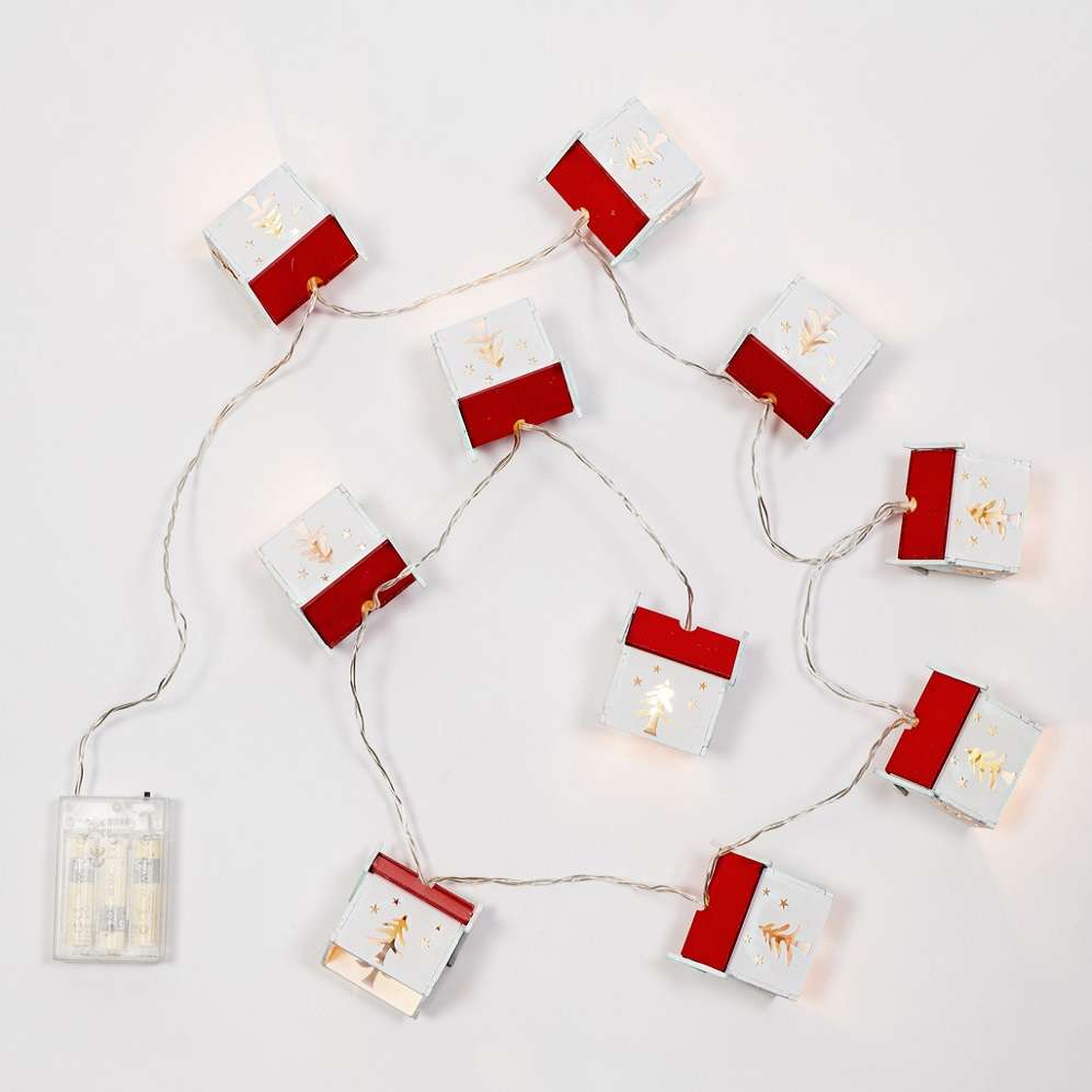 Casette LED H6 cm in legno bianco e rosso con 10 LED luce calda, luce fissa, a batteria, uso interno; addobbo festivo per interni dal design nordico.