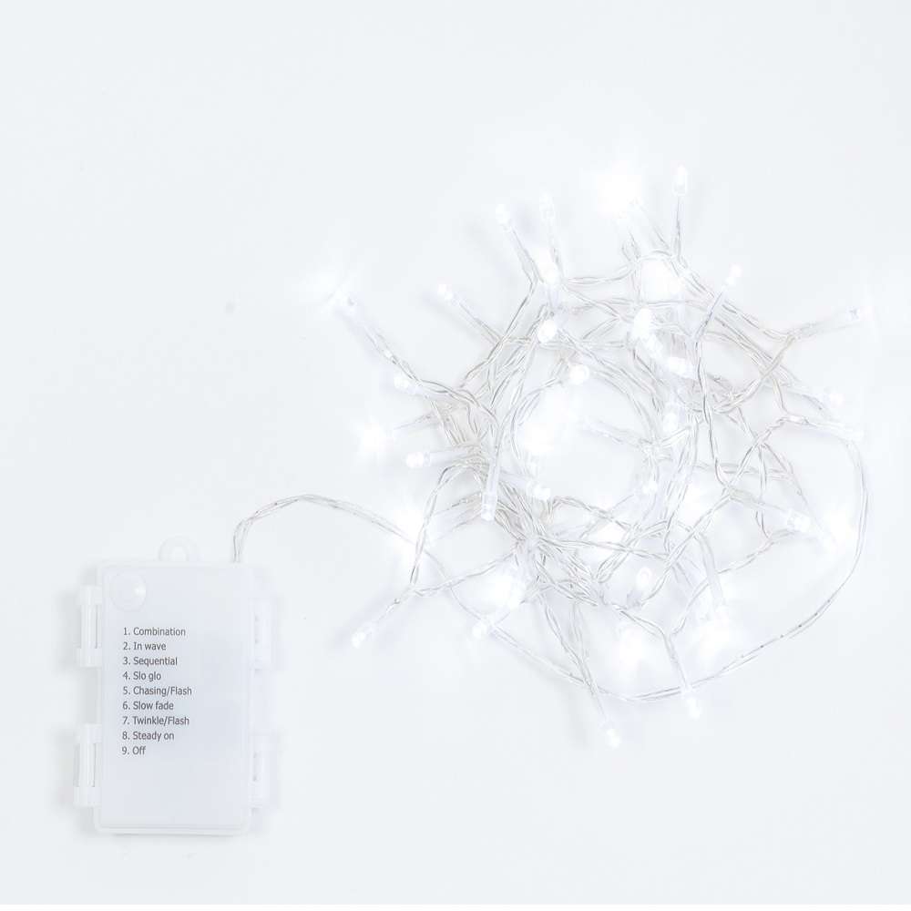 Catena 180 LED Bianco Ghiaccio – giochi luce con timer (6h ON/18h OFF) – L 9 m – filo trasparente – a batteria – uso esterno