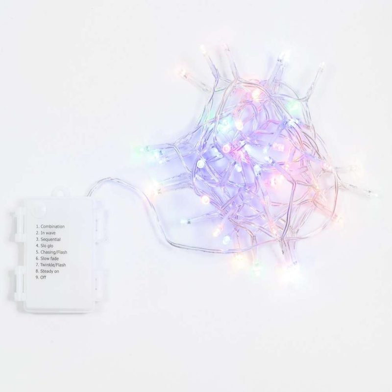Catena 48 LED Multicolor – giochi luce con timer (6h ON/18h OFF) – L 2,40 m – filo trasparente – a batteria – uso esterno