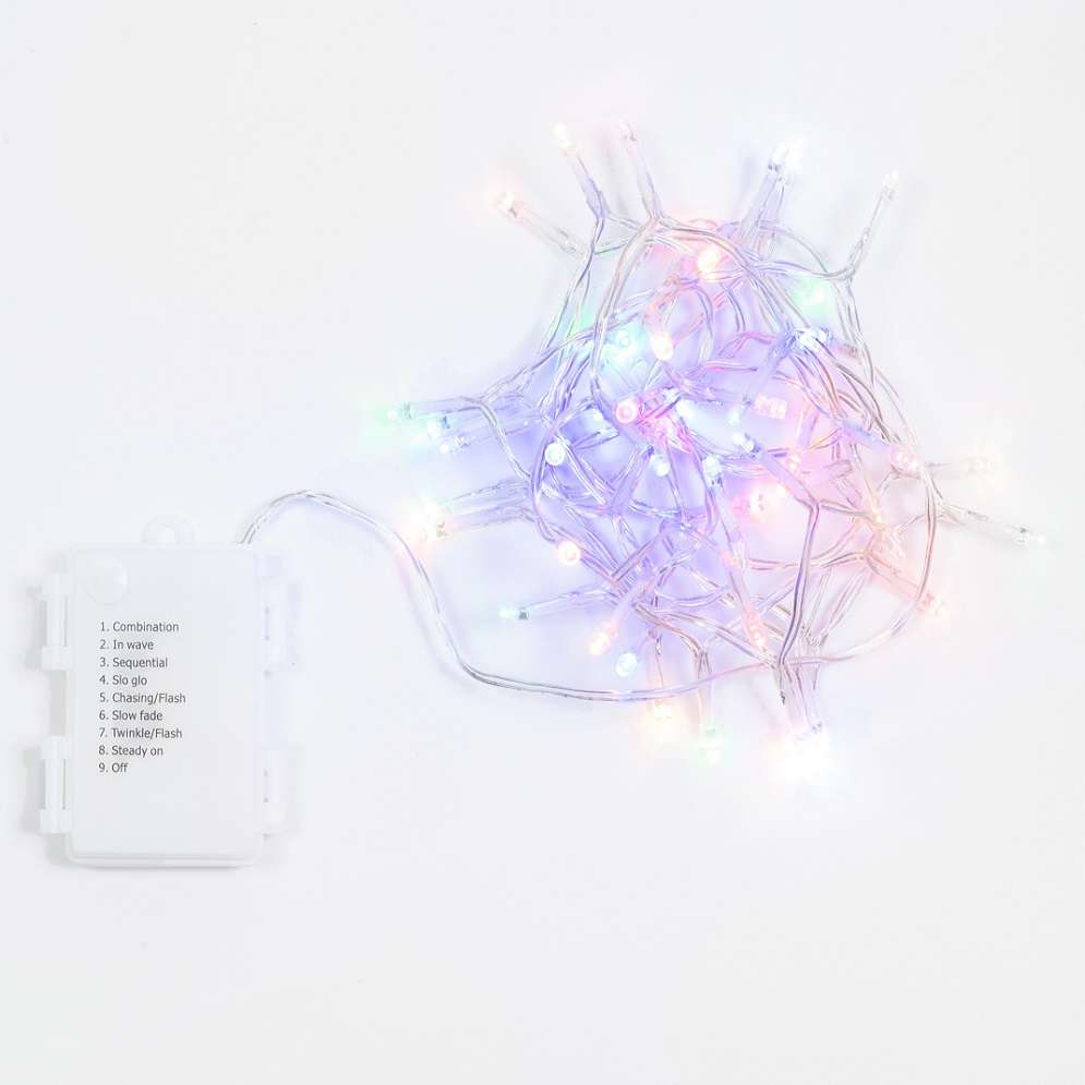 Catena 48 LED multicolor 2,4 m, filo trasparente con timer, a batteria per esterni; atmosfera festosa e allegra.